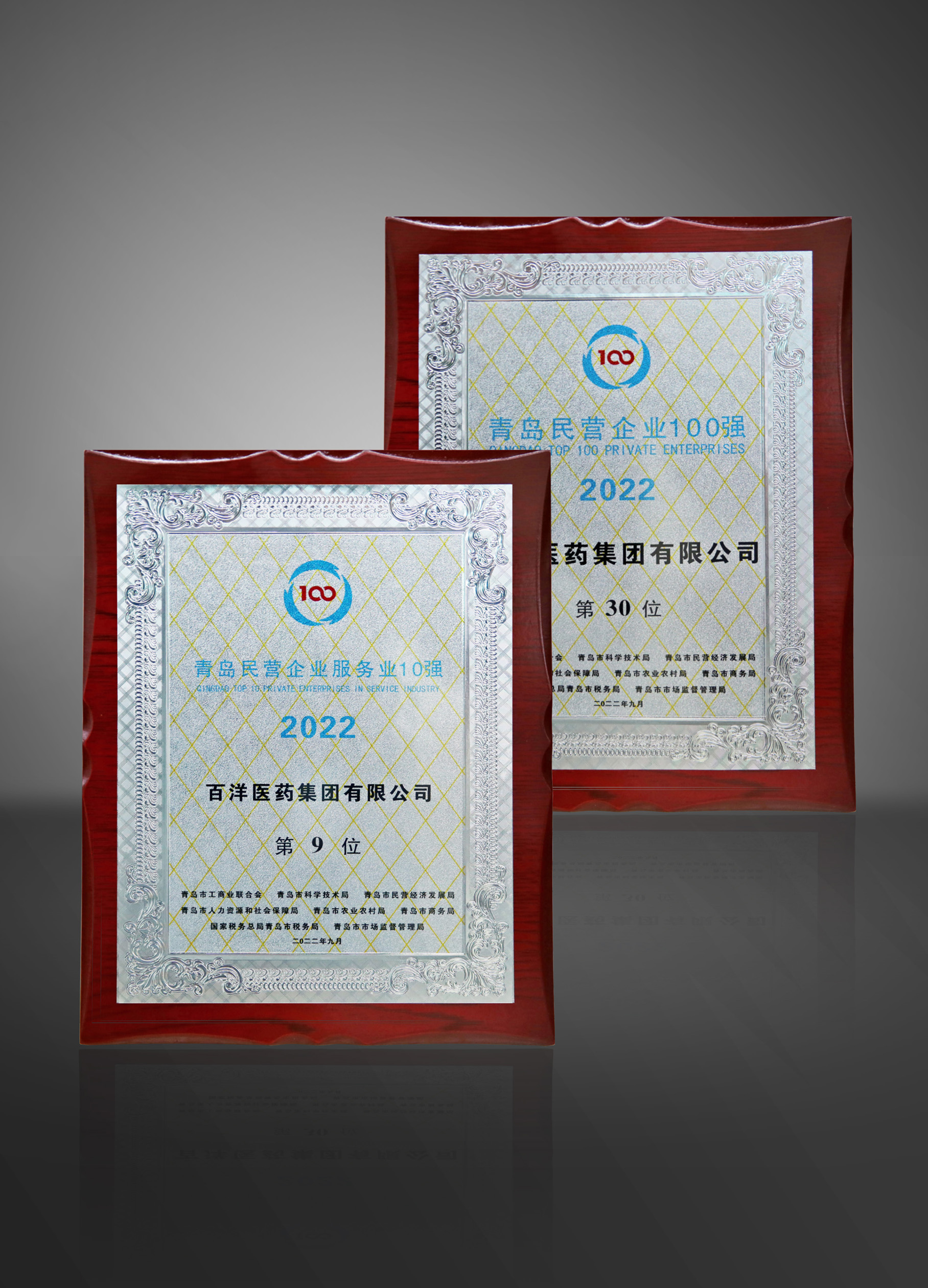 2022年百洋醫(yī)藥集團榮獲青島市民營企業(yè)100強,服務(wù)業(yè)10強