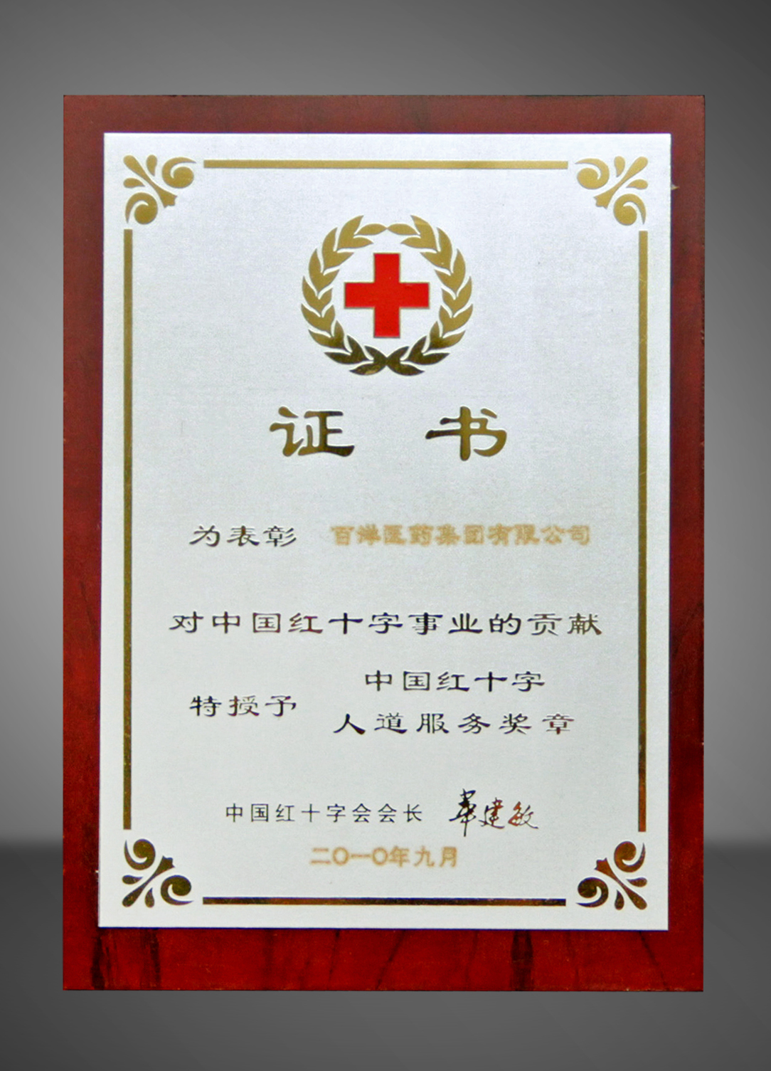 2010年百洋醫(yī)藥集團獲中國紅十字人道服務(wù)獎?wù)?/p>
